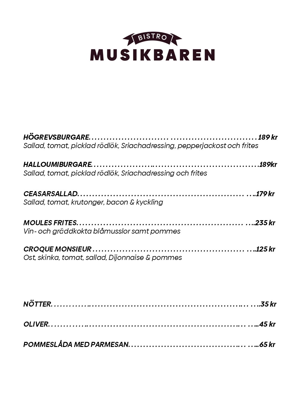 Musikbaren är det lilla mysiga stället mitt i Nynäshamns centrum. En bar & bistro där det skapats en mysig miljö. Här kan du avnjuta vällagade maträtter med något gott att dricka, här erbjuds även olika sorters livemusik.